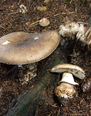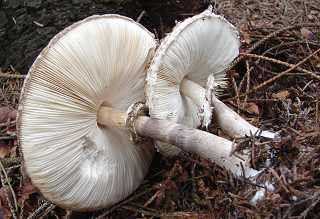Pied: épais, blanc, pelucheux, à anneau large et persistant; gros bulbe recouvert par une volve blanche à bourrelets verruqueux.