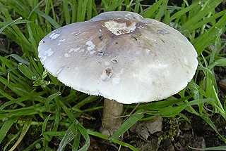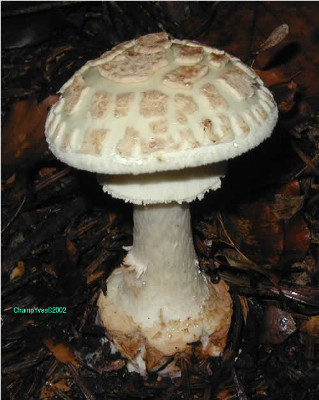Pied: blanchâtre, parfois marbré de verdâtre, anneau large, strié, persistant, blanc; volve très volumineuse, blanche également.
