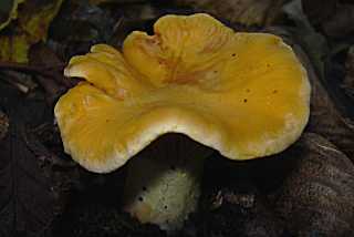 Chapeau: 3 à 8 cm de diamètre, à marge enroulée, creusé en entonnoir avec l'âge, orange vif.
