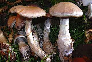 Pied: également visqueux, de même couleur que le chapeau, mais à mèches blanches sous l'anneau; anneau blanc brunissant.