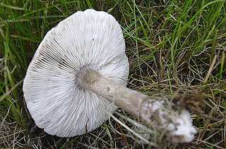 Pied: très élancé, un peu évasé sous les lames, terminé par un petit bulbe blanc soyeux, puis vite glabre, volve très fragile, restant en terre au moment de la cueillette.