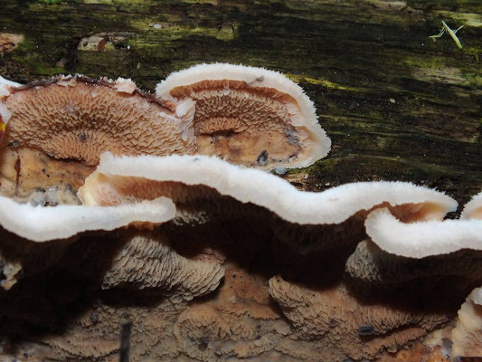 Description: en forme de console semi-circulaire, 5 à 30 cm de large, 2 à 6 cm d'épaisseur, avec ou sans pied rudimentaire, de couleur marron-clair, surface lisse, finement veloutée, craquelée avec l'âge et laissant apparaître la chair, marge arrondie, puis enroulée et ondulée