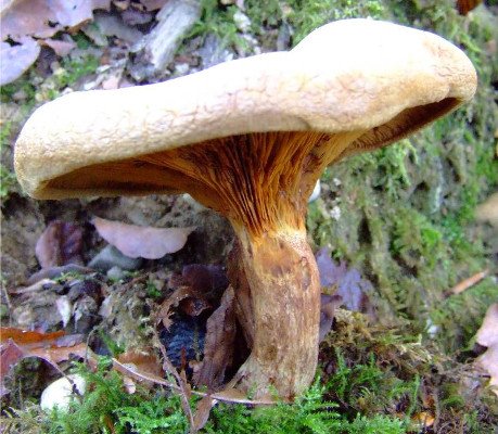 Chapeau: 2 à 7 cm de diamètre, brun-jaune, en entonnoir; marge ondulée.