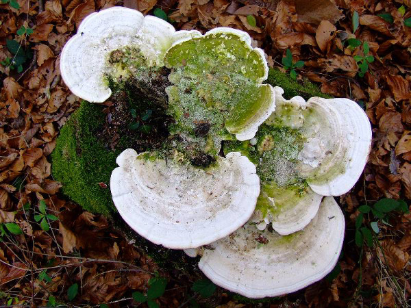 Chapeau : de 5 à 20 cm, en forme de console ou plateau incurvé, en éventail, velouté à l'état juvénile, de couleur blanche à grisâtre devenant verdâtre vers le centre (par développement d'algues), à zones concentriques