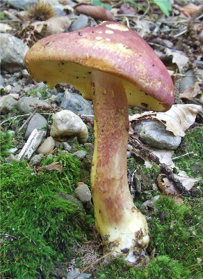 PIED : 3 à 10 cm, rougeâtre-vineux et jaunâtre au sommet, bleuissant au toucher