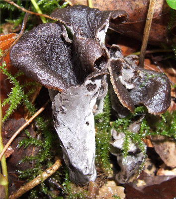 Description: haut de 5 à 15 cm, en forme de cornet ou de trompette, creux jusqu'à la base marge recourbée vers le bas, devenant ondulée, brun-noir vers l'intérieur, gris cendré, parfois plus foncé à l'extérieur.