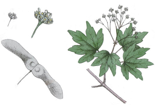 - feuilles caduques vert foncé à 5 ou 7 lobes dentés.
