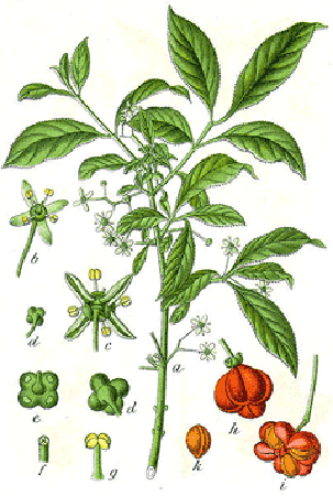 - fleurs blanchâtres à nombreuses étamines donnant des fruits marron de 15 mm de diamètre comestibles à pleine maturité.