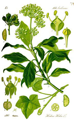 - Les fruits sont de petites baies noires violacées de 6-8 mm disposés en grappes, composées de trois graines et à chair molle.