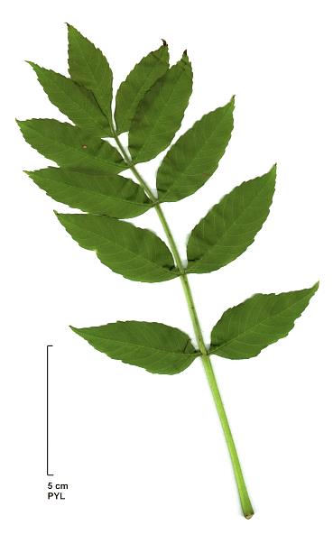 - Ses feuilles caduques, opposées et imparipennées sont composées de 5 à 7 folioles, régulièrement dentelées, un peu plus velues sur les nervures.
