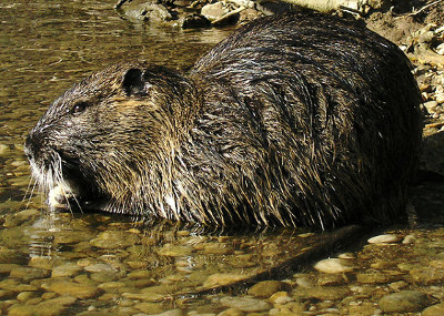 Le ragondin est reconnaissable à ses quatre grandes incisives orange, comme chez les castors, mais tirant plus sur le rouge.