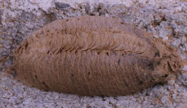 -Ponte dans une masse ovale lamelleuse ou oothèque abandonnée par la femelle