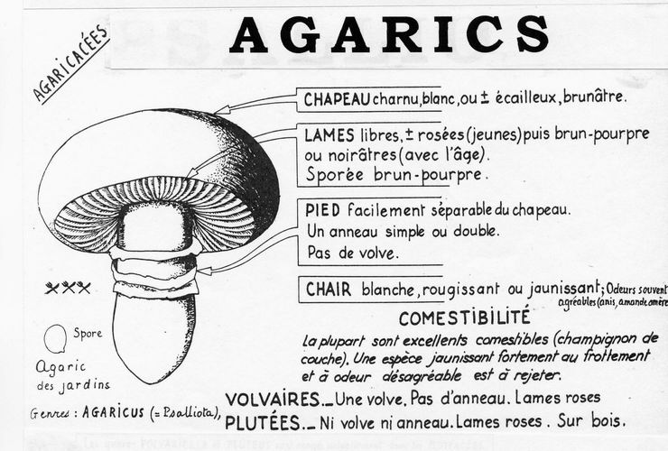 Les agarics sont des champignons dont les lamelles, libres, sont roses lorsque le champignon est jeune, puis brun-noir à noires lorsqu'il vieillit.